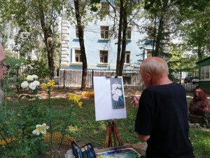 На территории отделения, как раз, много интересных живописных объектов - розы, лилии, кустарники, деревья. Здесь и тень, и солнце, и жарко, и прохладно. Здесь разные люди, разные судьбы, разные истории, но сейчас их объединяет одно - ИСКУССТВО, неожиданно и интересно!!!