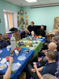 За праздничным столом священник храма Арсений Аванесян, отслужив молебен, возглавил неспешную душевную беседу. Он ответил на вопросы, которые волнуют наших подопечных, от духовно-нравственных до политических, включая отношение к сегодняшней ситуации в стране и мире.